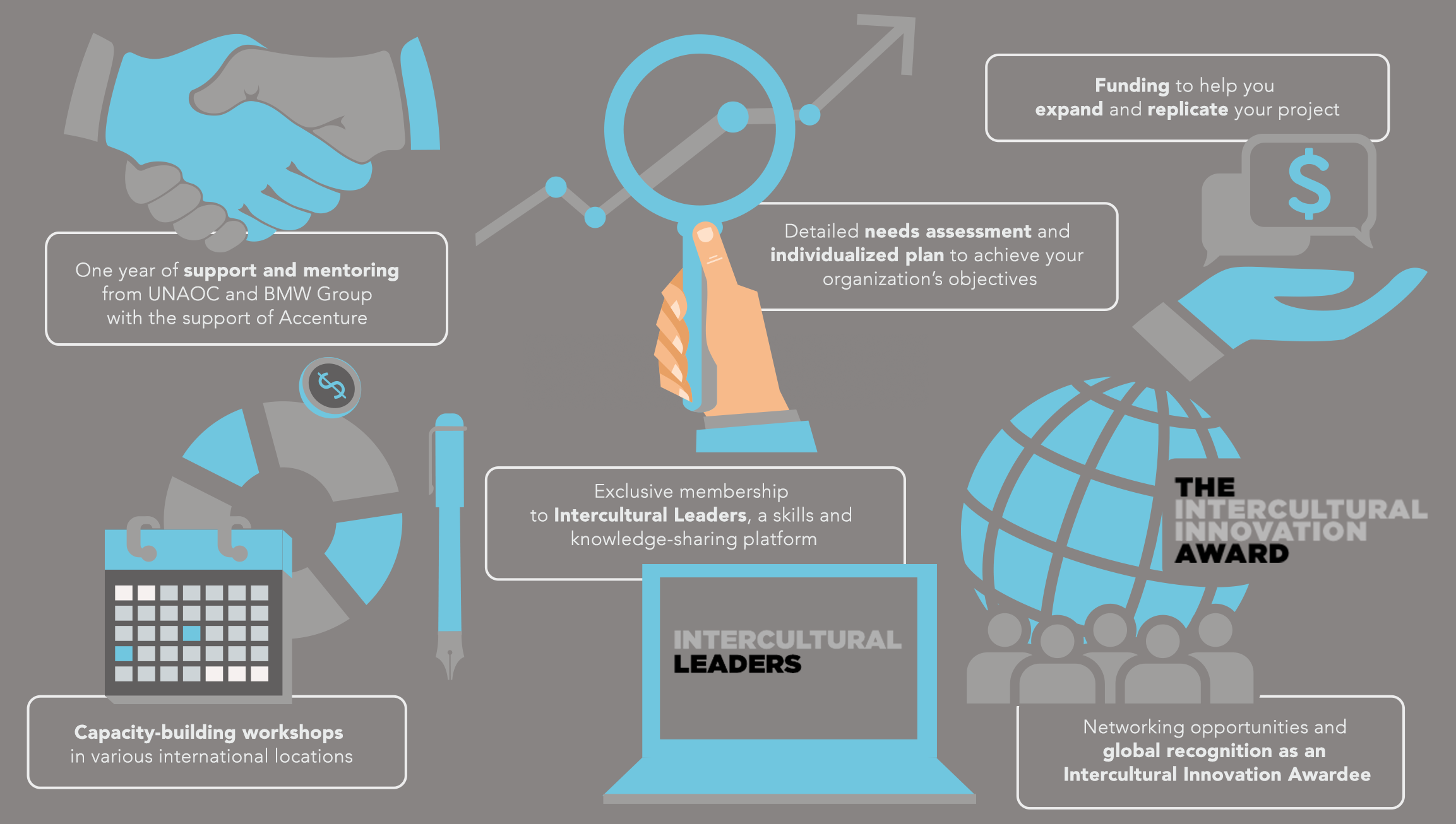 The Intercultural Innovation Award is bestowed upon ten organizations. Awardees will benefit from a comprehensive one-year capacity-building program aimed at strengthening their work. The support program will consist of funding, training and capacity-building, customized support and mentoring. Support will also be provided to successful projects so that they can be replicated in other contexts or settings where they might be relevant. The specific support received will depend on the individual needs of the projects.